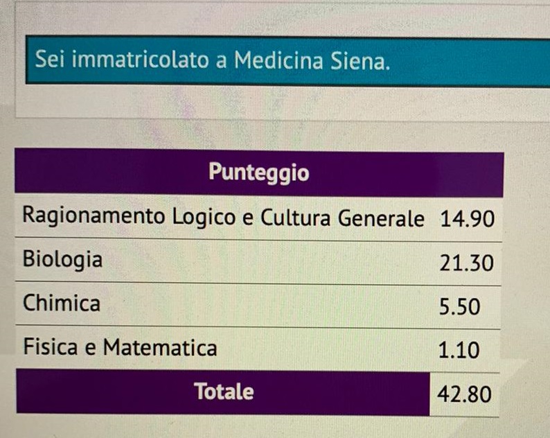 Il 17 settembre sono stati pubblicati i risultati anonimi per codice etichetta: non ricordavo il mio codice, che avevo letto di sfuggita per pochi secondi prima di consegnare il foglio, ma sono riuscita a risalire al mio risultato grazie al punteggio che avevo calcolato consultando le soluzioni, divise per materia, e avevo un vago ricordo di una lettera e un numero presenti tra gli ultimi caratteri del mio codice.